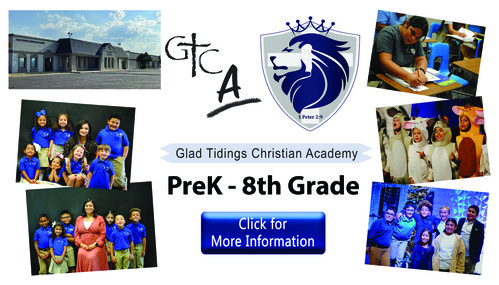• Glad Tidings Christian Academy...GTCA is having an amazing school year! The Lord is blessing in so many ways. His presence is tangible in our chapels and classrooms. Proverbs 22: 6 says “Train up a child in the way they should go, and when they are old they will not depart from it.” GTCA accepts transfers throughout the school year. Tuition assistance is available! Grades PreK-8th. Complete your child’s application online today! For more information call (806) 620-0595 or visit us online at...